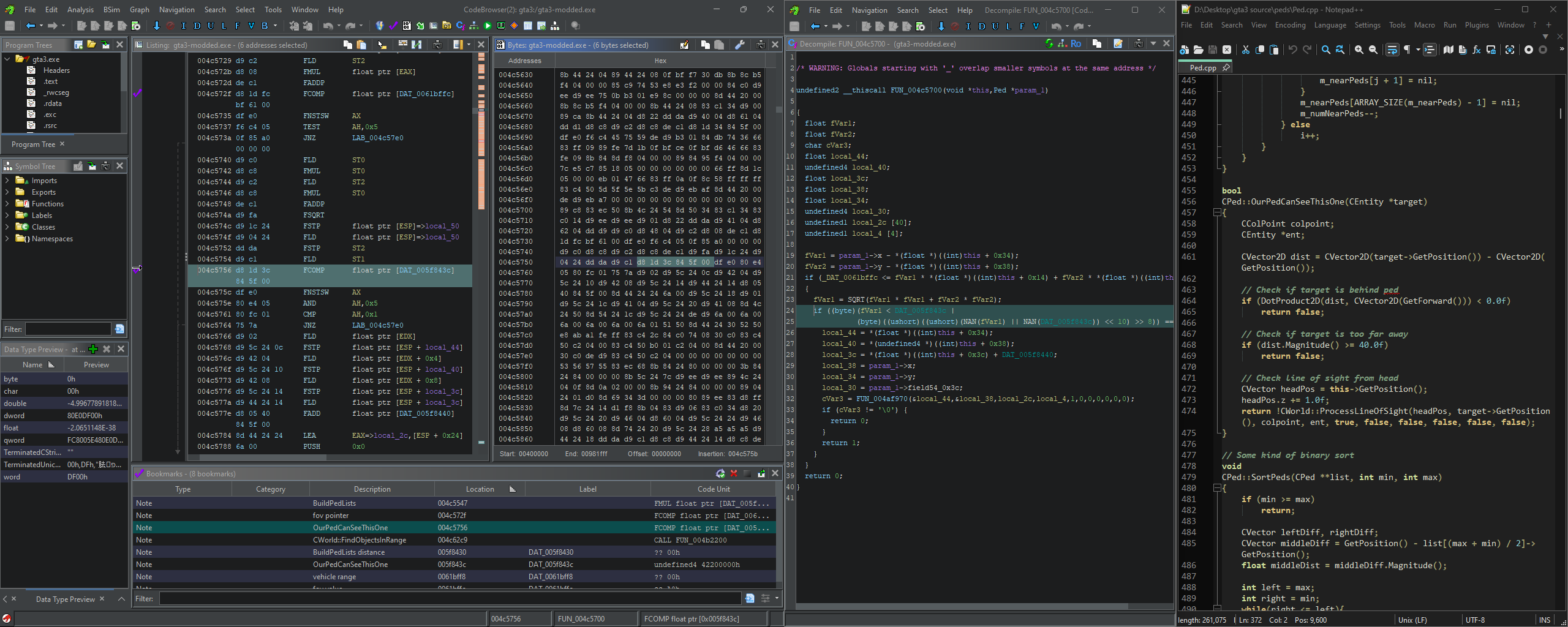 I looked all through the list of opcodes for mission scripts to see if there was any other way to affect the gang threat system, but alas, found nothing (other than turning the gang threat off completely). I started asking Claude about the project, and it confirmed what I was dreading: probably the only way to mod the gang threat behavior was to patch the executable, which naturally seemed overwhelming. But then Claude made me aware of a critical resource, a project that fully “decompiled” the GTA3 executable to readable C++. With that as a reference, trying to find the right bytes to patch actually seemed within reach.