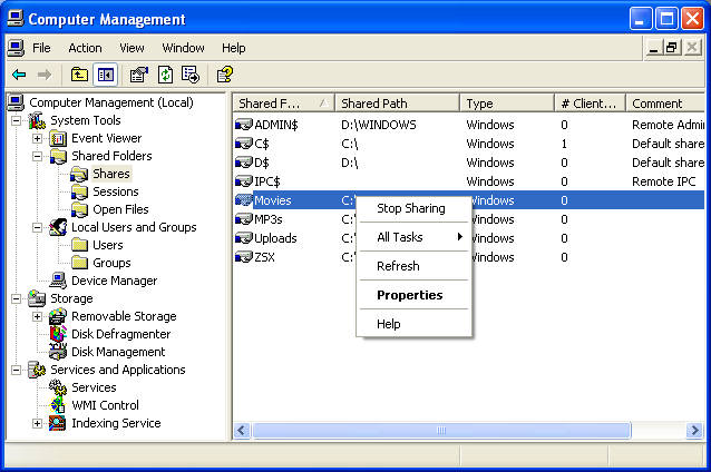 Shares list in Computer Management console.